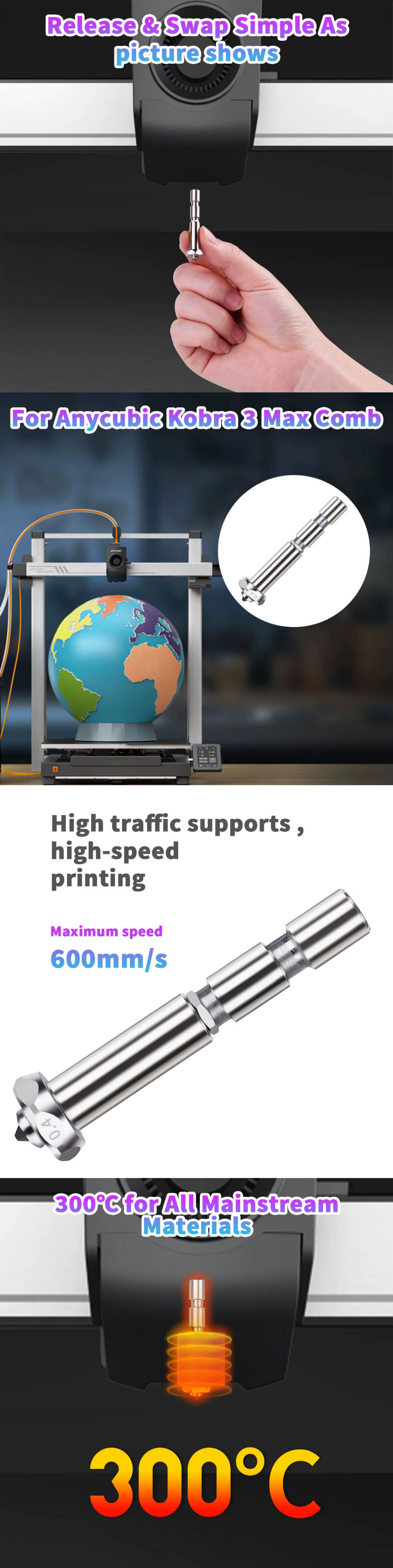 پرینتر Anycubic Kobra 3 Max برای چاپ قطعات بزرگ با سرعت بالا طراحی شده است. برای اینکه بتوانید از تمام پتانسیل این غول دنیای سه بعدی استفاده کنید، داشتن یک هات اند سالم و باکیفیت ضروری است. این محصول، نسخه اصلی و جایگزین مستقیم (Original Replacement) برای سری کبرا ۳ مکس است که هماهنگی کاملی با اکستروژن دستگاه دارد.
