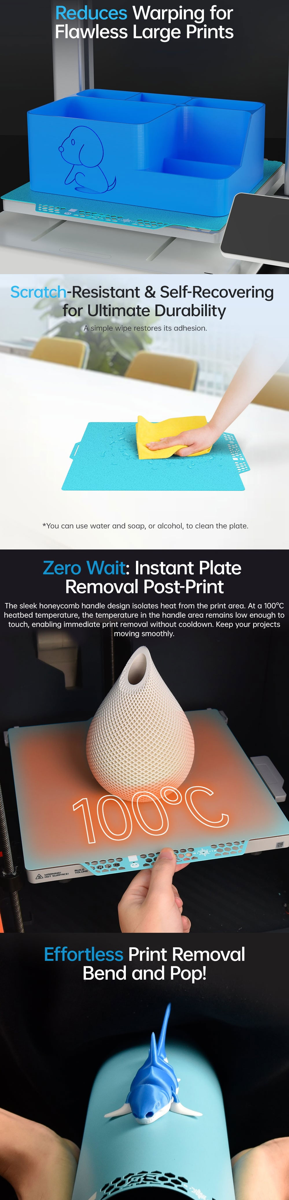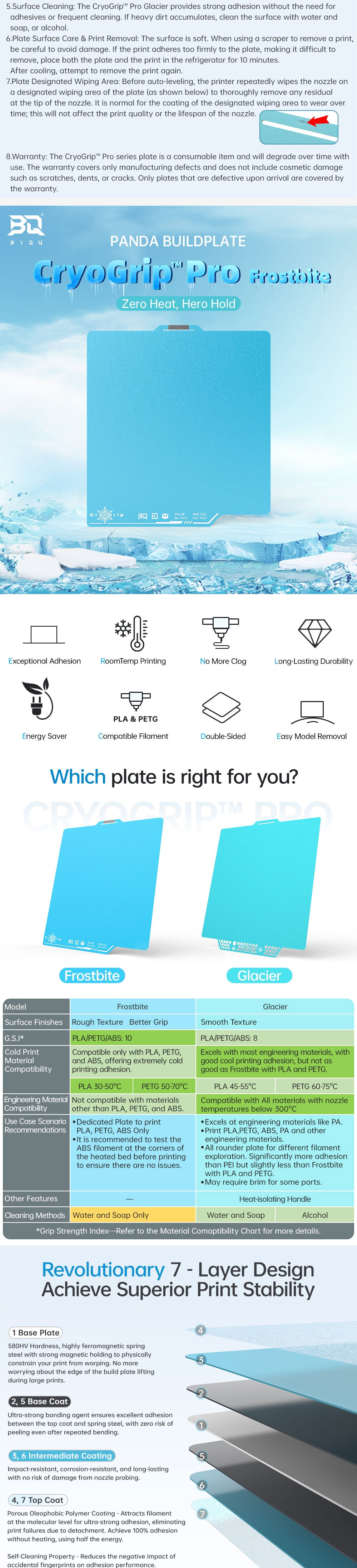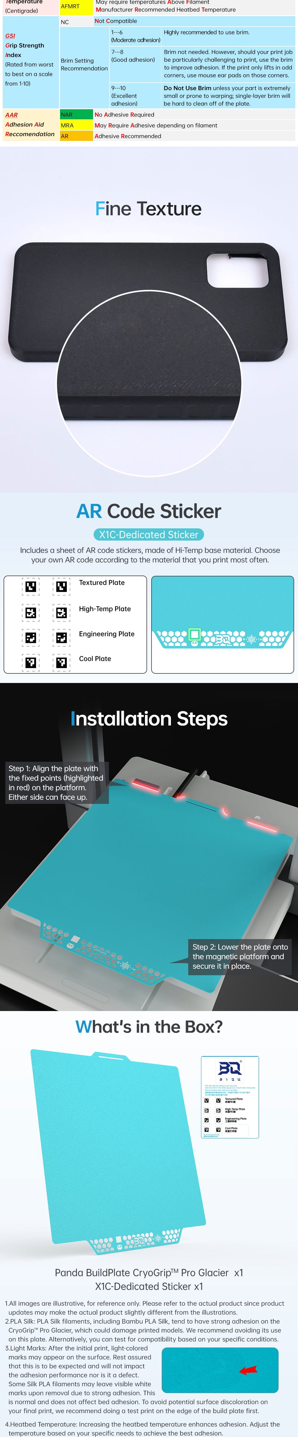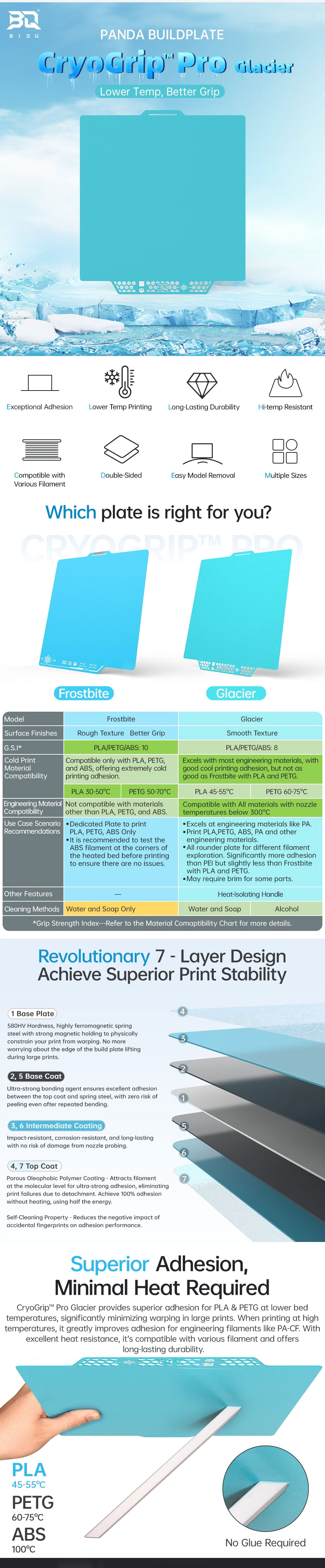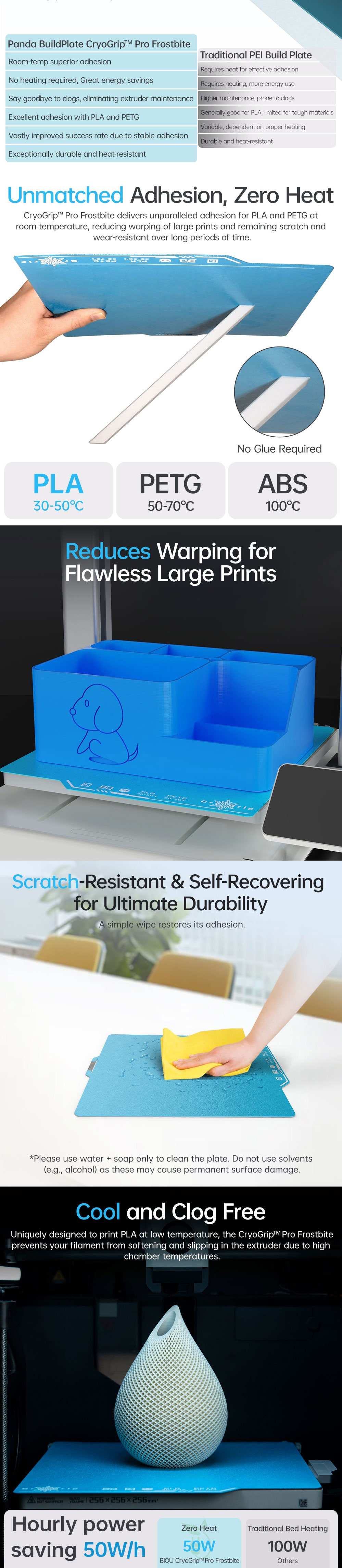 نسخه Frostbite از سری محبوب Panda، یک گام فراتر از صفحات معمولی است. این صفحه با داشتن بافت درشت (Coarse Texture)، سطحی ناهموار و مهندسی شده ایجاد میکند که به معنای واقعی کلمه فیلامنت را در آغوش میگیرد. اگر با پرینترهای ابعاد بزرگ مانند Bambu Lab H2D/H2S کار میکنید، میدانید که چسبندگی لایه اول در مساحتهای بالا تا چه حد بحرانی است؛ Frostbite راه حل قطعی شماست.