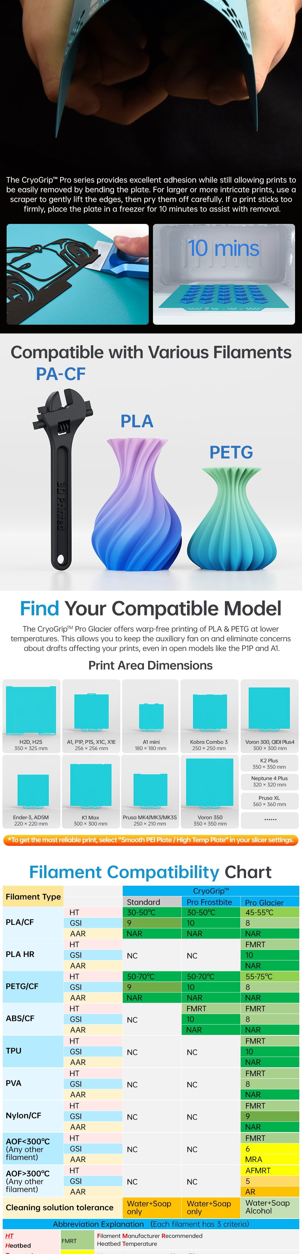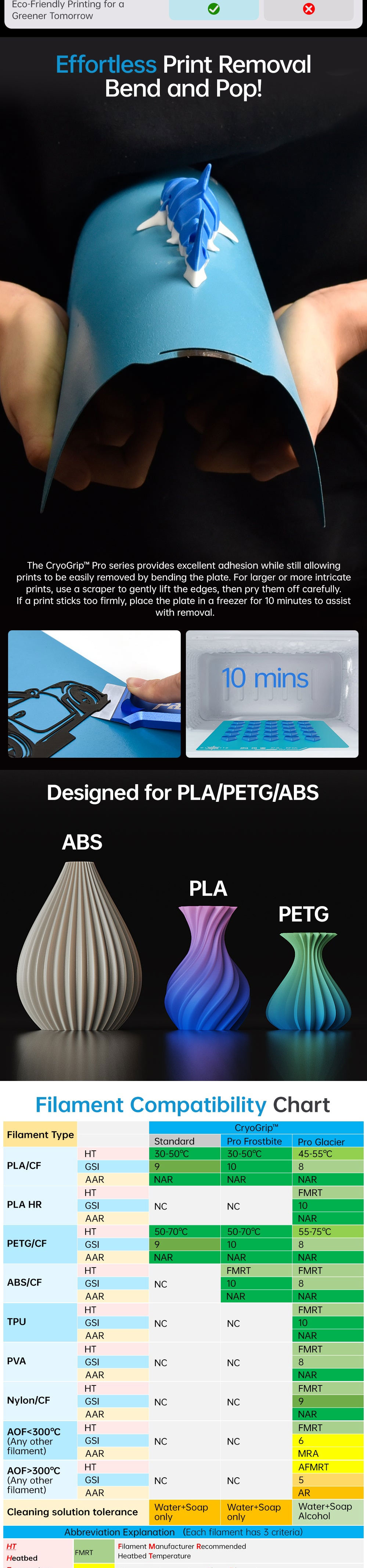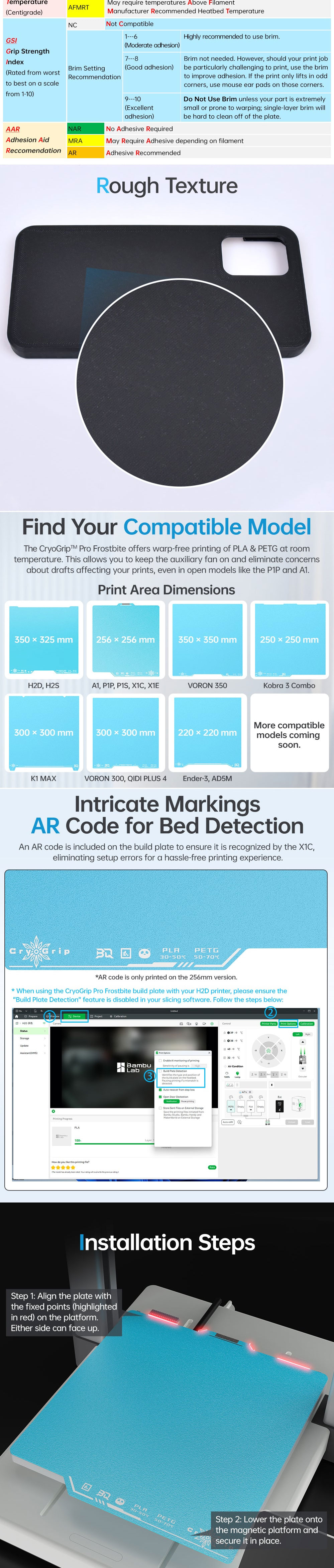 در مدل Frostbite، ویژگیهای شیمیایی سری CryoGrip با ویژگیهای مکانیکی بافت درشت ترکیب شده است. این یعنی حتی در دماهای پایین تخت، قطعه شما کوچکترین جابجایی یا بلندشدگی نخواهد داشت. این صفحه برای متریالهایی که به "پیچش" یا Warping معروف هستند (مانند ABS و ASA) یک انتخاب استراتژیک است.